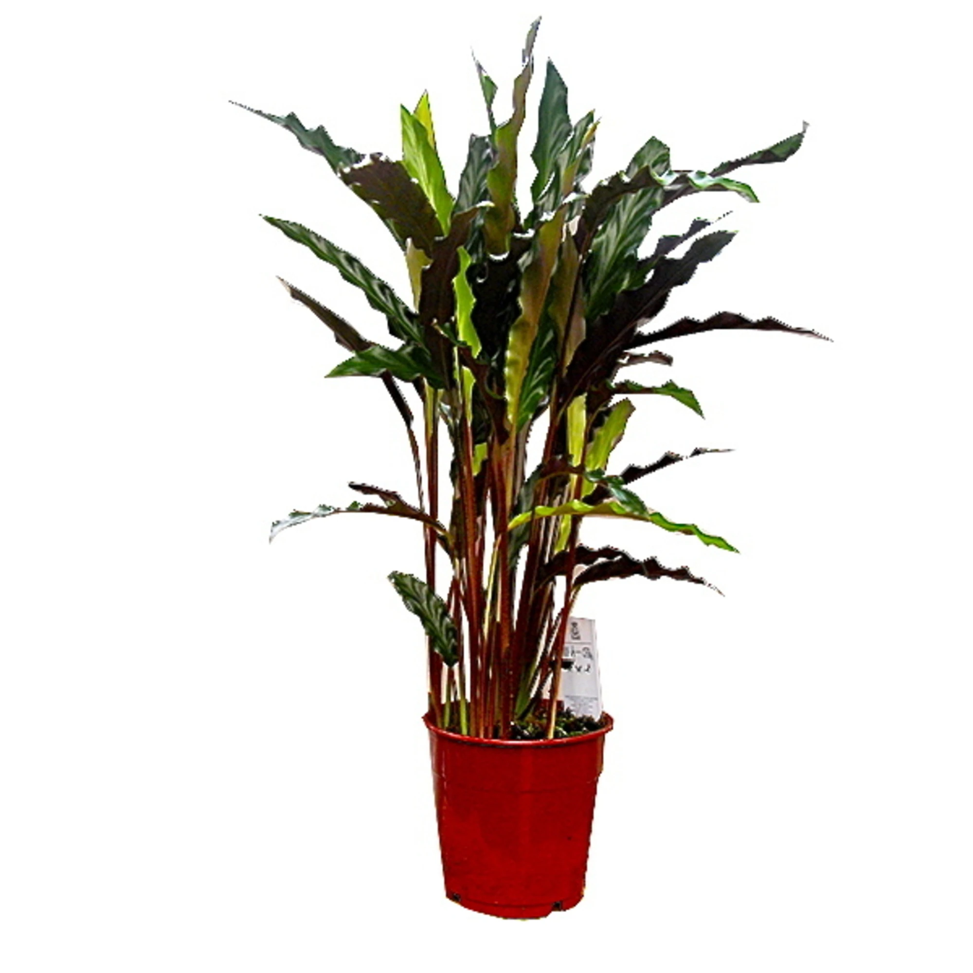 Калатея конфьюжн поразительные пестрые листья с желтыми, темно-зелеными и белыми пятнами и полосами. Большие листья означают, что это превосходное растение для очистки воздуха.