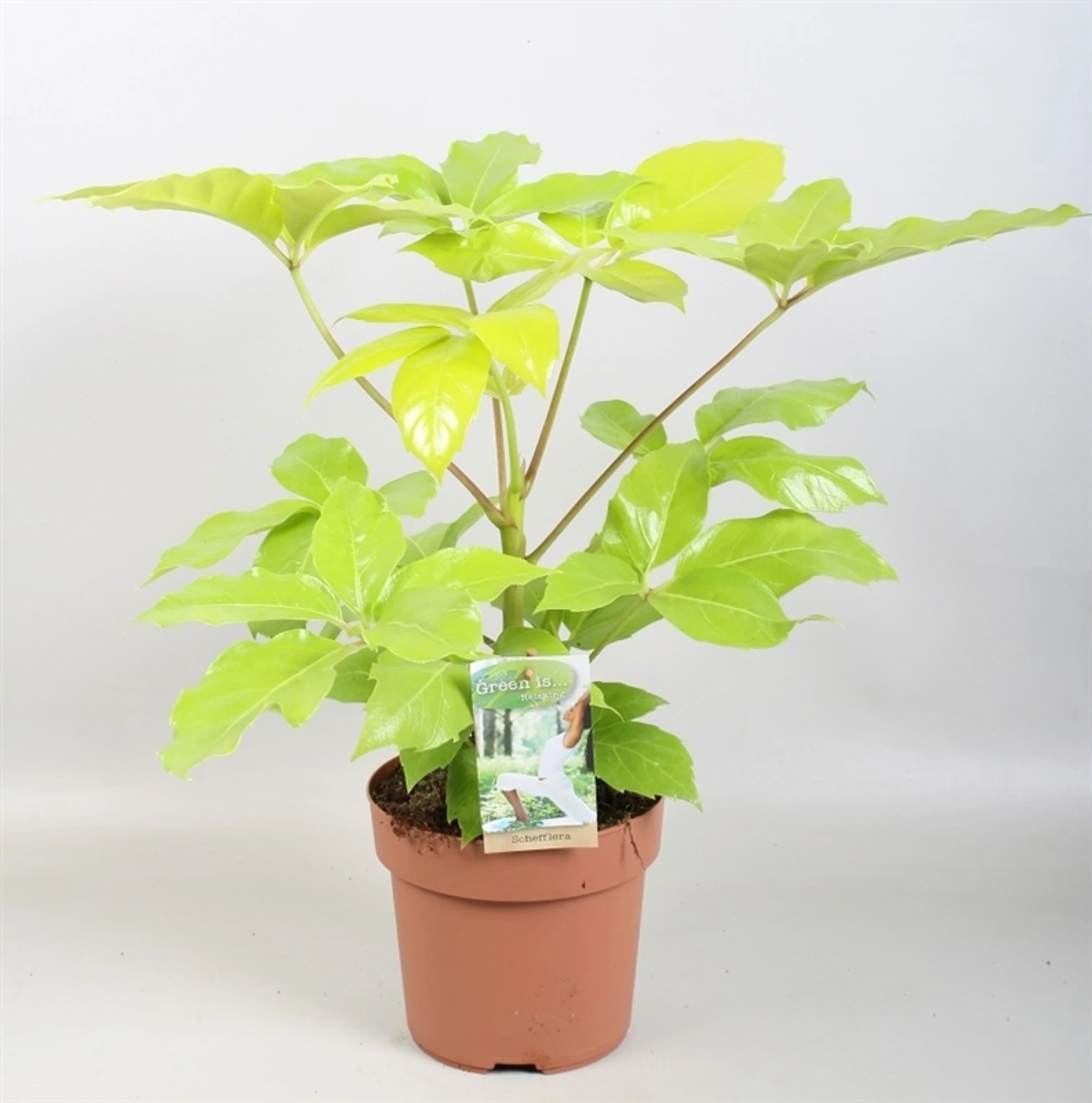 Шеффлера (Шефлера) Голден Амате (Schefflera Golden Amate) — редкая шеффлера, которая отличается своими крупными размерами: высокорослое растение, легко достигающее 2 -3 м высоты даже в комнатных условиях, листья сложные, состоят из желто — зеленых, глянцевых, относительно широких пальцев, даже взрослые растения не оголяют нижнюю часть ствола, листопад не наступает даже в условиях низкой освещенности.